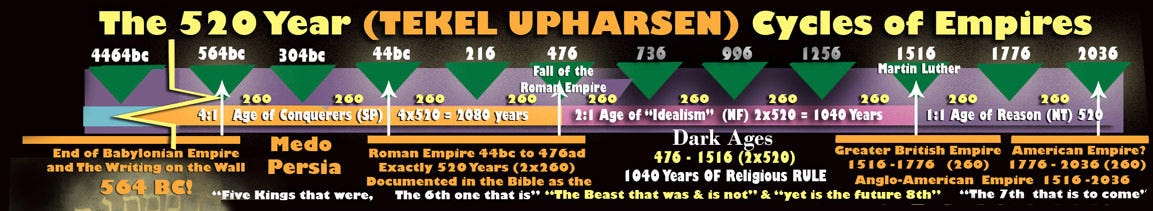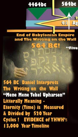 2) The “Writing on the Wall” MeneMene Tekel Upharsen (research here) A time map created by Godtype research some time ago points out the patterns of “520 Year Cycles of Empires” going back to 44bc and the Ides of March. Godtype then discovered King Nebuchadnezzar’s Reign ended exactly 520 years earlier in 564bc? Add to this the “writing on the wall” event occurred the night before his Grandson Belshazzar ultimately lost HIS kingdom on the eve a ghostly disembodied hand wrote “Mene Mene Tekel Upharsin” These words simply mean “Eternity is Measured & Divided by Empires of 520 years!” The Godtype Time Map was clearly being taught in our Holy Scriptures, deciphered by Daniel long ago……