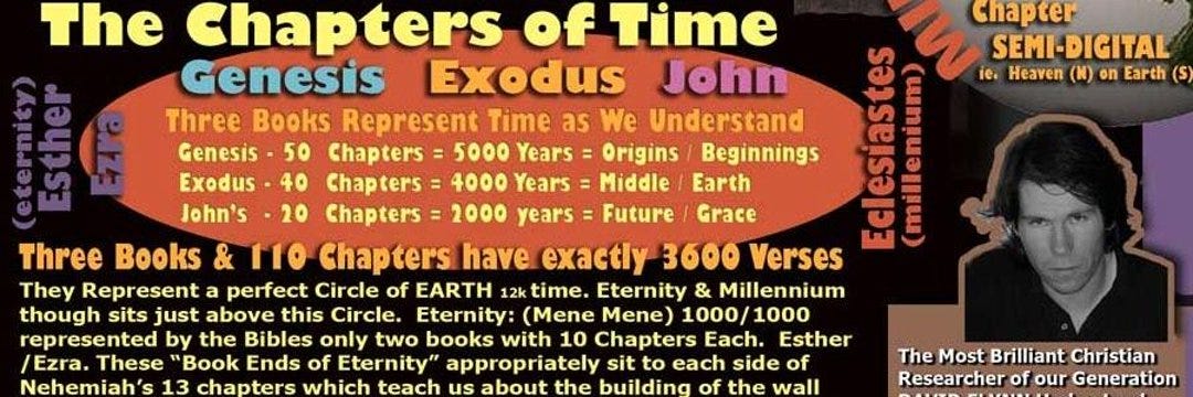 3) “The Chapters of Time” There are 3 books that represent time as we understand (Past,Present,Future) 2 books represent eternity (mene,mene). 1 book represents “Man’s” fallen time on Earth as documented by King Solomon. Their verses/chapters compute to PI to 6 Digits 3.14159. Amazing. Chapters correlate with Godtype. Genesis-50, Exodus-40, Gospel of John-20. Their Verses add up to 3600 (a perfect circle). They Represent the Past / Unknown beginnings, Present / Center of time ie BC & Future AD Christian Age. Can their be two books which represent eternity? – the “Mene Mene” of the writing on the wall? Sure enough there are only 2 books with only 10 chapters each! Duplicitous Esther and Ezra. Add their verses to 3600 (Eternity sits above time as we understand) & divide into our available time/energy of 12,000 subtly yet clearly taught to us in Genesis 6:3 & we arrive at PI to 4 digits! When we recalculate with the Book I intuitively understood represented Man’s wisdom and his entire time on earth Eclesiastes / 12 Chapters – 222 verses we arrive at PI to 6 digits! 3.14159